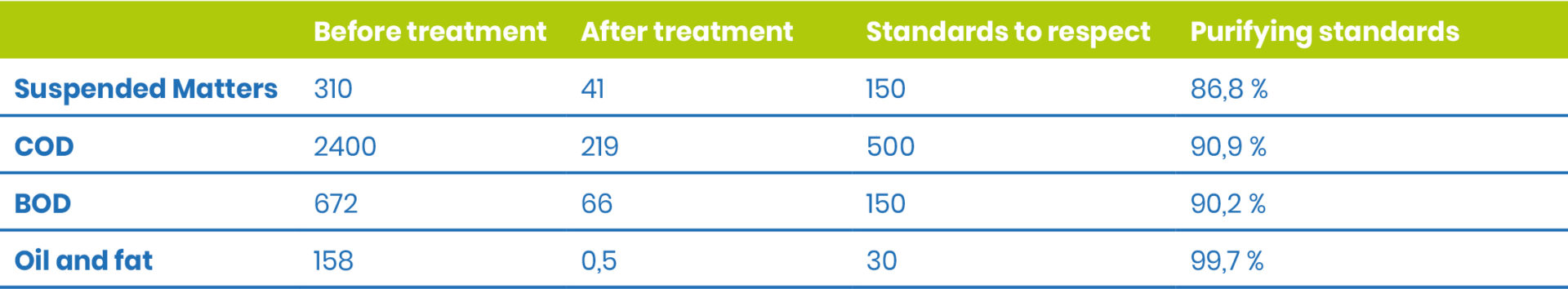 With a purifying yield between 87 and 99%, the solutions brought by FAIVRE permits to the plant oil factory to become on-standards. With an optimized study, only 5 FLOPULSES 44kW are necessary to obtain those results.